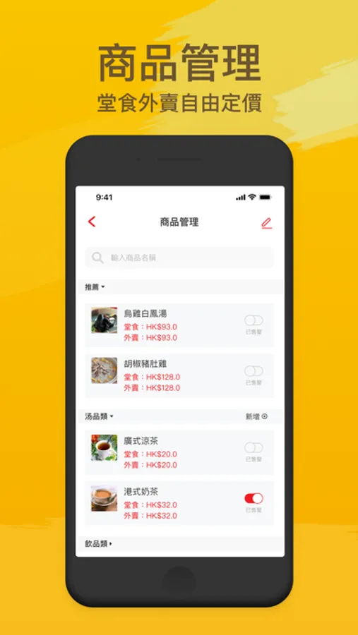 自訂添加菜式名稱、相片、價格、銷售狀態一鍵處理。