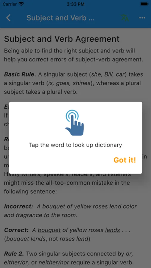 - Dictionary lookup by tap the word for more easier understanding English Grammar