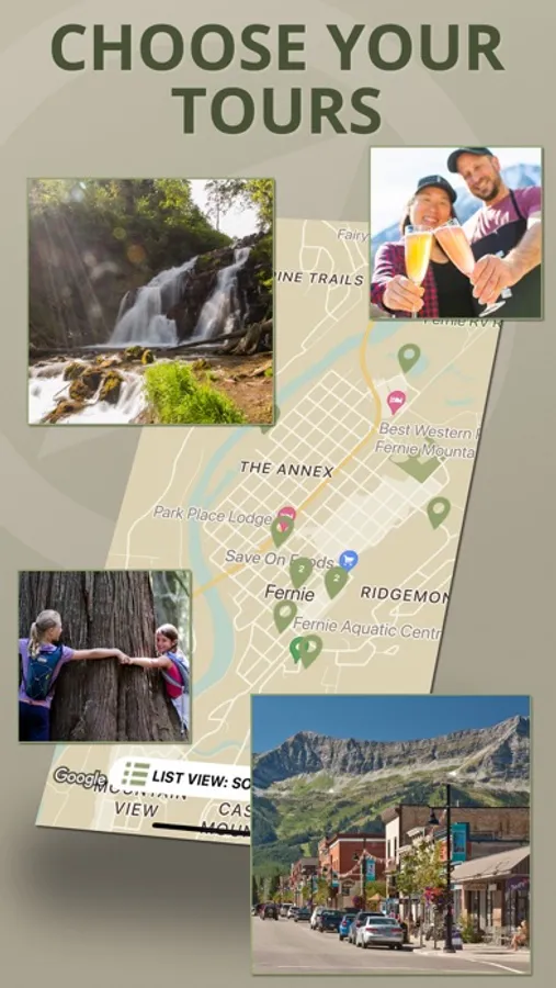 The Explore button takes you to the list of themed self-guided tours, from Best View Spots, Artistic Explorations and Local Heritage to Nature Walks, Family Fun and the unique Taste of Fernie.