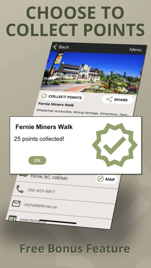 All locations are assigned a point value, which can be collected when you are within GPS range of a location and have a connection to the internet. Pushing the “Collect Points” button while physically visiting a location will add the location’s points to your point total. The more locations you explore, the more points you collect. A free Iconic Fernie account is necessary in order to collect points and redeem rewards. You can track your point total on Your Account page.