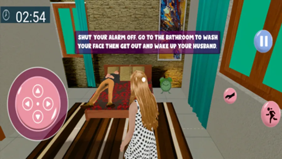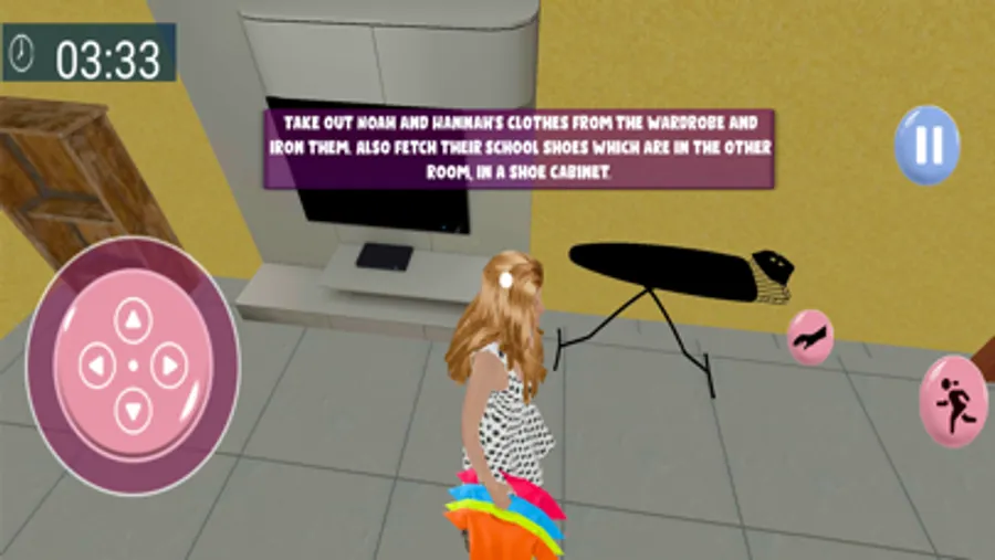 It's time to wake up and start a new day! Shut your alarm off and get out of bed. Go to the bathroom to wash your face then get out and wake up your husband. Time to wake up the kids! Go downstairs and wake up Noah and Hannah. I must iron the kids' clothes for school! Take out Noah and Hannah's clothes from the wardrobe and iron them. Also fetch their school shoes which are in the other room, in a shoe cabinet. Take care of virtual family & Experience mother remote life in mom life sim Game.