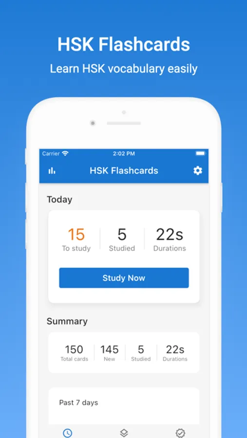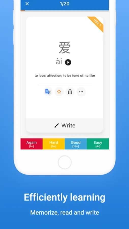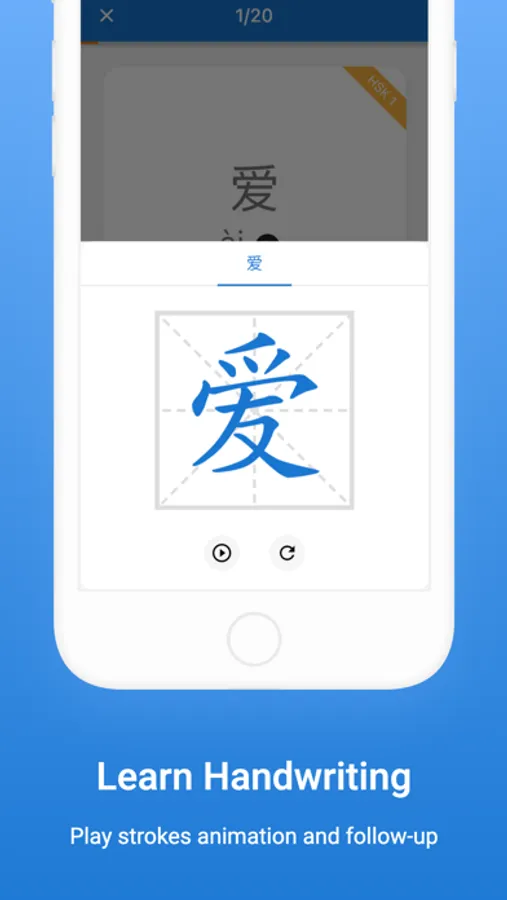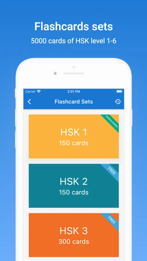 The app contains all 5000 vocabulary cards of the latest HSK(Hànyǔ shuǐpíng kǎoshì, 汉语水平考试) 1-6, which can help you memorize, read and write Chinese vocabulary easily, and all for free.