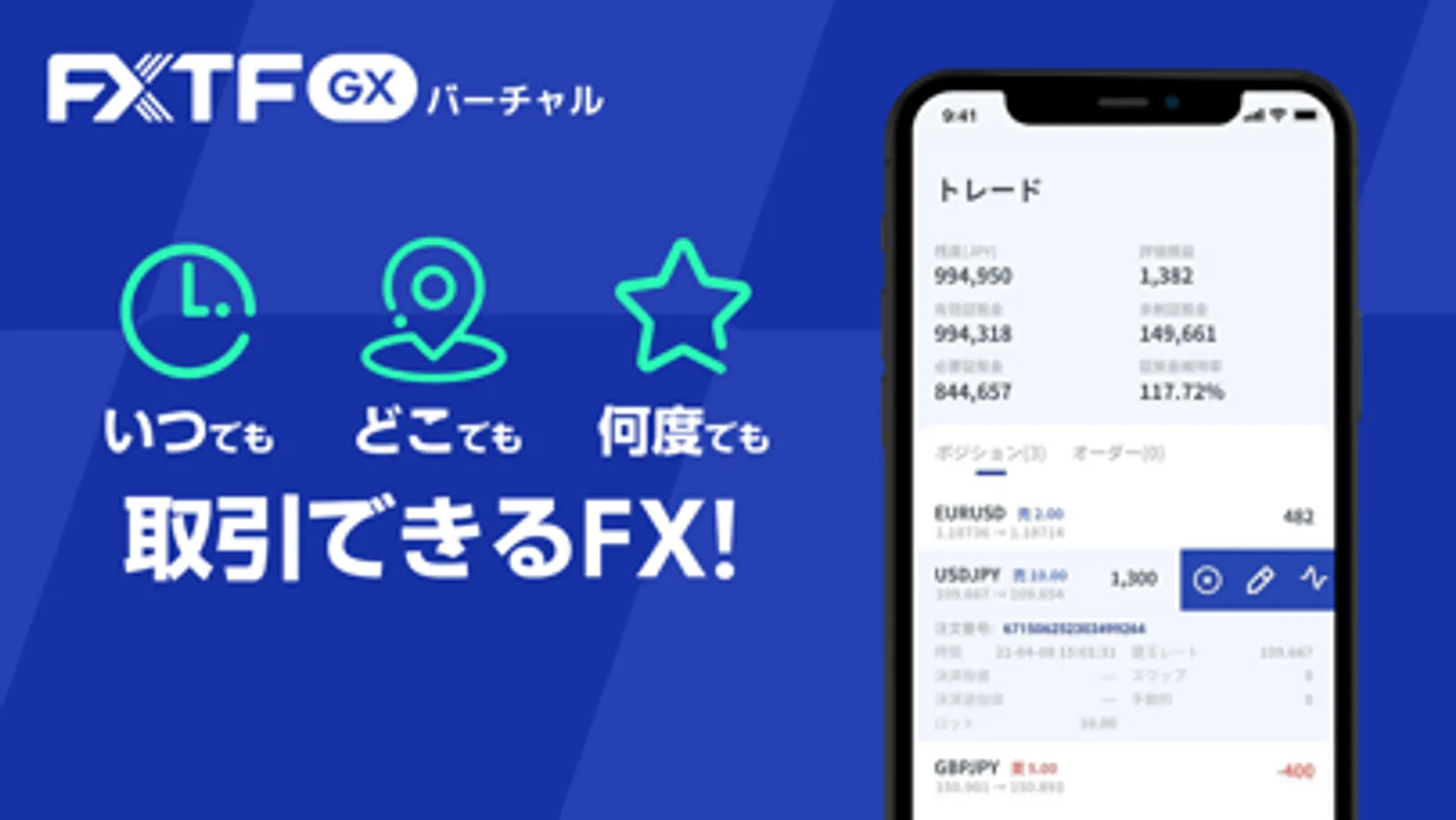 仮想の資金が入金済みなので、本番取引の前に、取引の練習や操作の確認が可能です。