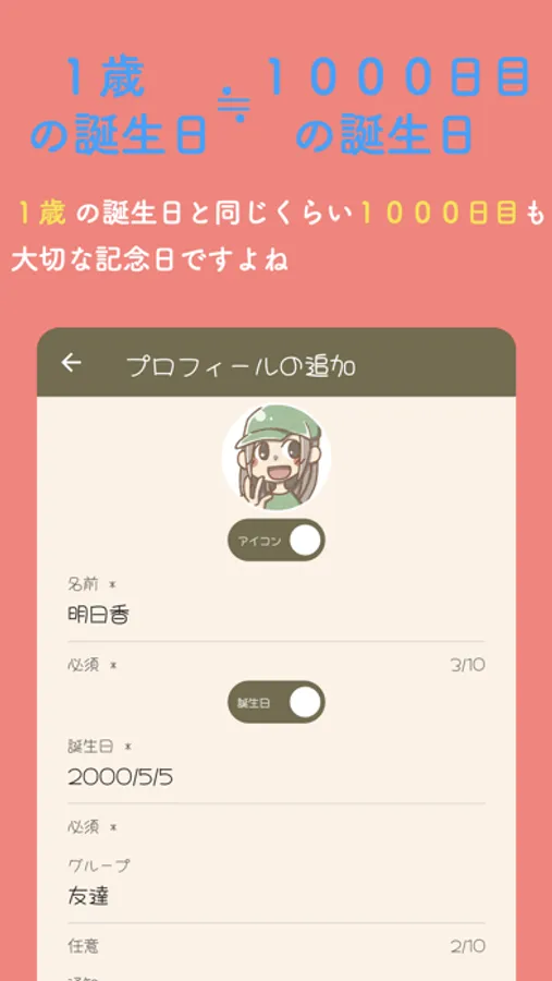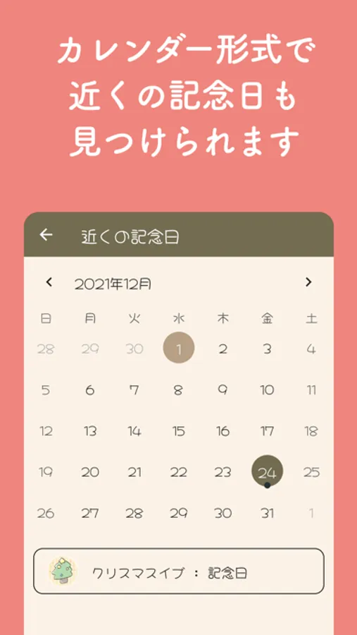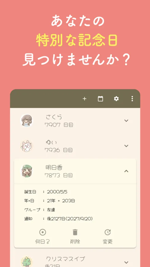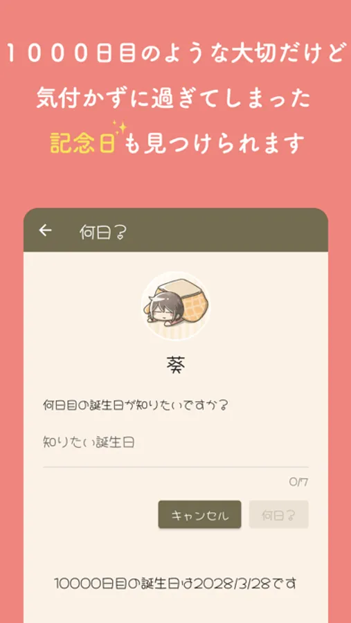 「10歳の誕生日」「20周年の記念日」はもちろん、「愛する人と出会ってから1000日目」「押しがデビューして500日目」「ペットの○○が家に来て300日目」とかも見つけられます。
