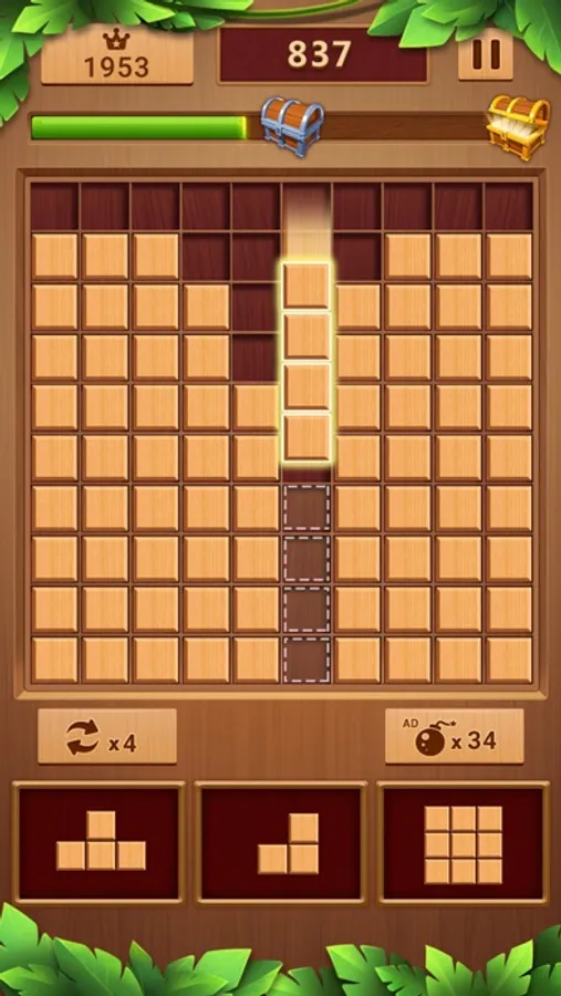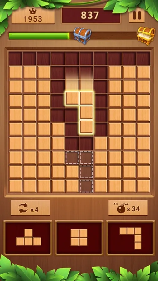 This is a 10×10 puzzle game. The rule is very simple. Put the three wooden blocks below into the chessboard. When the horizontal and vertical directions of the chessboard are filled, the wooden blocks will be eliminated. The more rows and columns eliminated, the higher the score obtained. Once there is no place to place a block on the chessboard, the game ends. In the game, you can use rotating props to help you change the direction of the wooden block. You can also use bomb props to blow up blocks you don't want or cannot place. Use props and place blocks cleverly, and you will become a master of wooden puzzles!