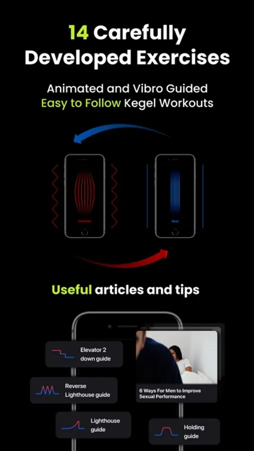 Science based ready to use Kegel Workouts, Pelvic Floor Muscle strength tracker, ED & PE solution, self-reporting Intimate Health analytics - all this followed by related content.