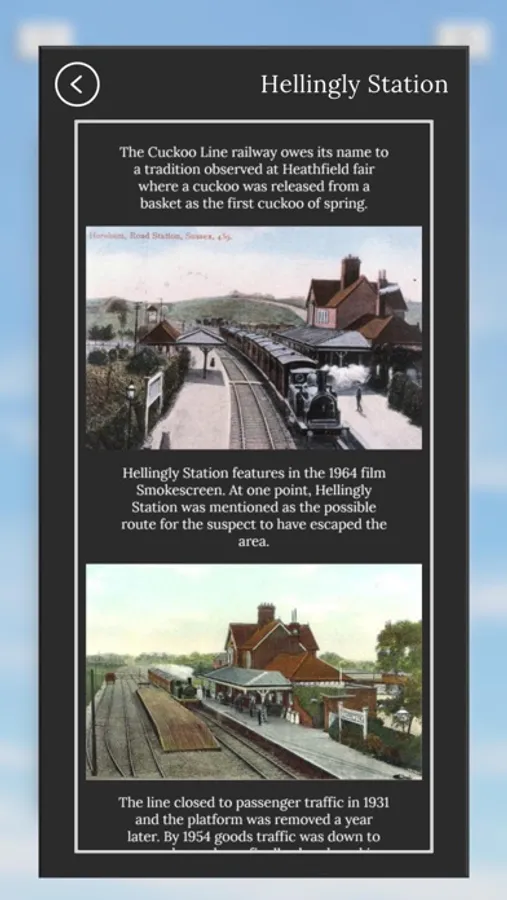 This app will take you on walks around the Hellingly and Heathfield area showing you places along the way that have stories from the past.