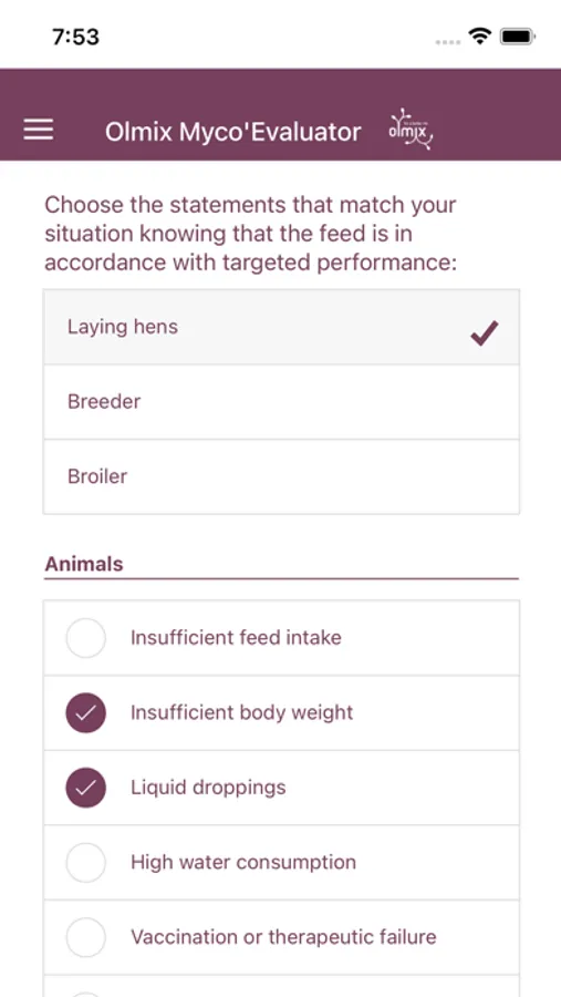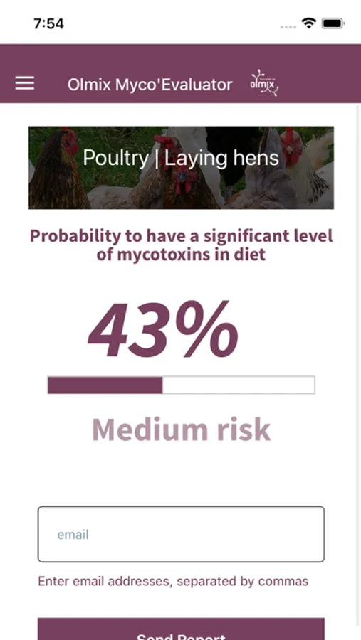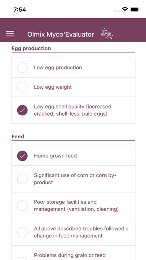 Olmix Myco’Evaluator helps to identify risk factors of mycotoxin contamination thanks to the audit of crop and feed management, storage conditions and animal symptoms. From these risk factors, Olmix Myco’Evaluator calculates the probability of high mycotoxin contamination in feed. This is the first step of the mycotoxin diagnosis developed by Olmix.