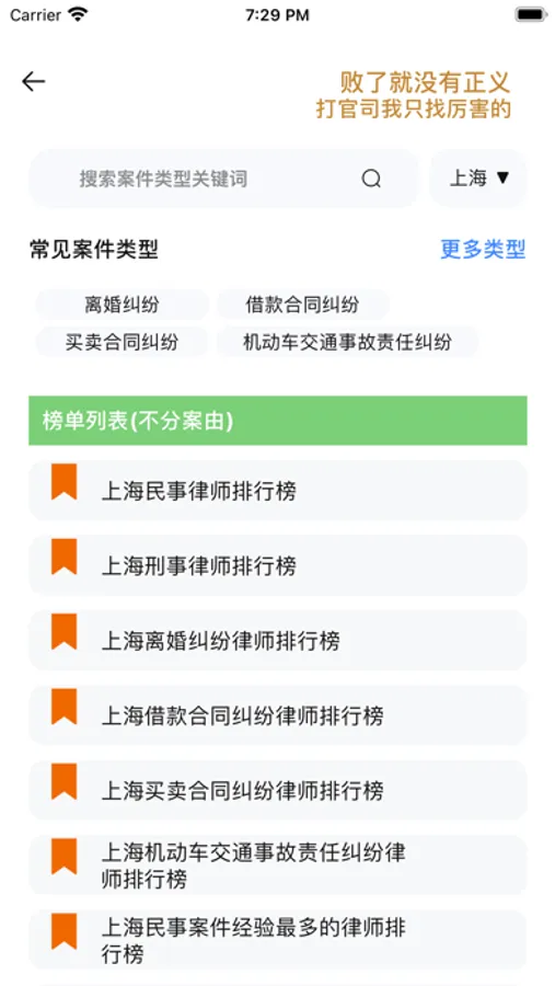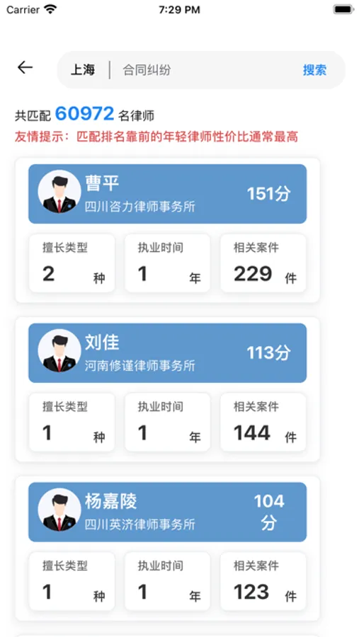 区别于其他找律师产品,盛律找律师汇总了全国50万+律师数据,能够为用户提供全量的律师档案查询功能。所有律师你都可以查到他的业务数据,“不做人为的信息阻断”,帮助用户在公开透明的信息里筛选合适律师。