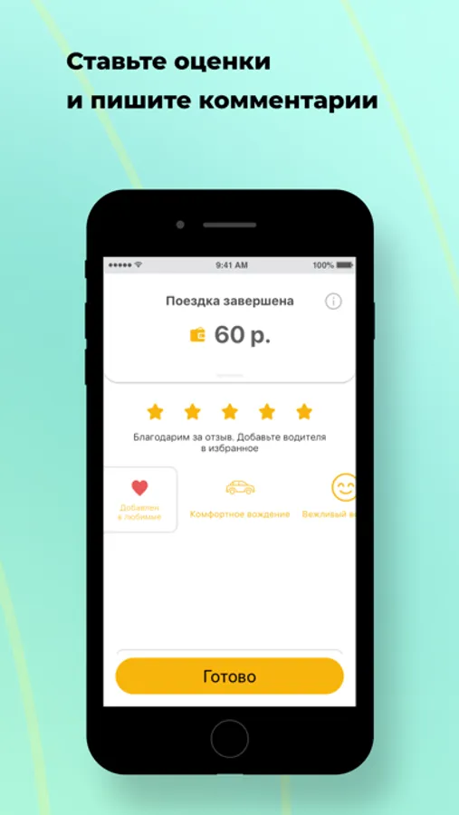 Поставьте оценку водителю, напишите отзыв или выберите реакцию из готовых шаблонов. Посмотрите детализацию платежей после поездки.