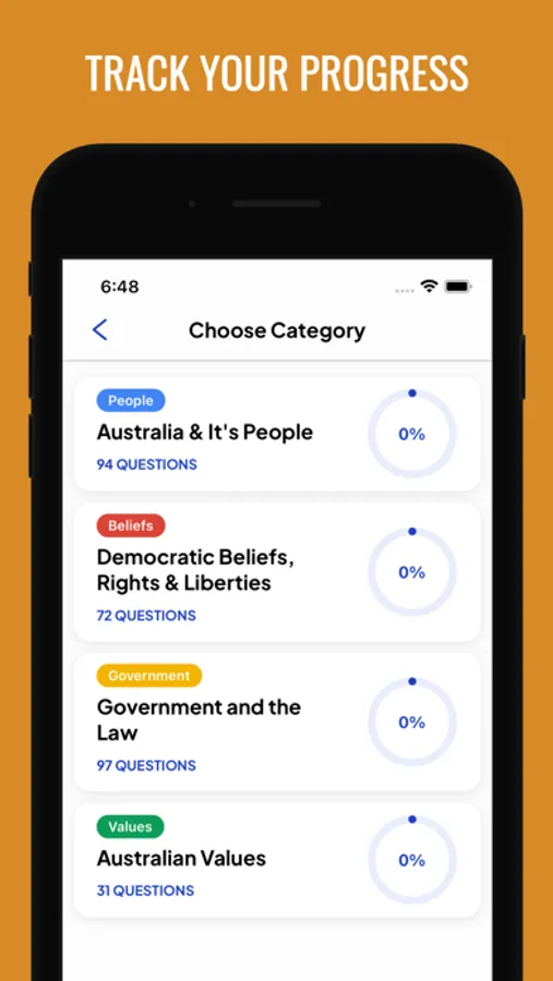 - Over 250 questions divided in 4 sections, History of Australia, Democratic, Beliefs, Rights, Liberties and Laws.