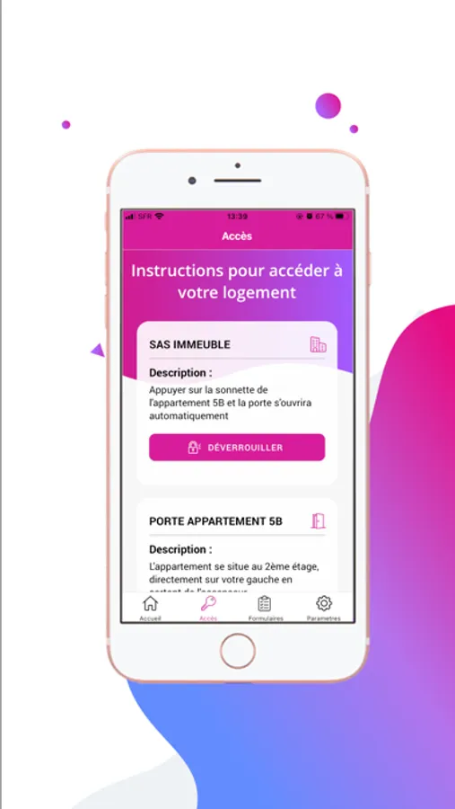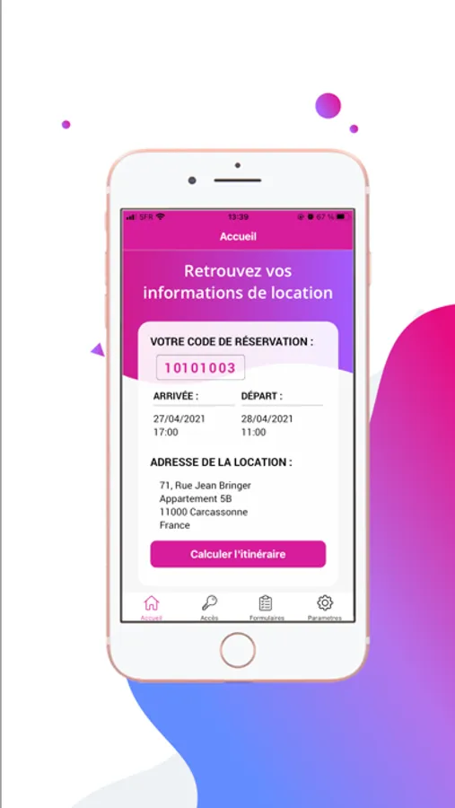 En quelques clics, depuis votre smartphone vous pourrez prendre connaissance de votre réservation, lancer le guidage jusqu'à la propriété réservée, accéder en toute autonomie à l’hébergement, tout savoir sur ses équipements, accéder aux documents de voyage (règles de la maison, livret d'accueil, manuels des équipements électroménager, etc.) et faire vous-même votre check-in … plus de stress c’est vous qui gérez votre arrivée en tout autonomie !