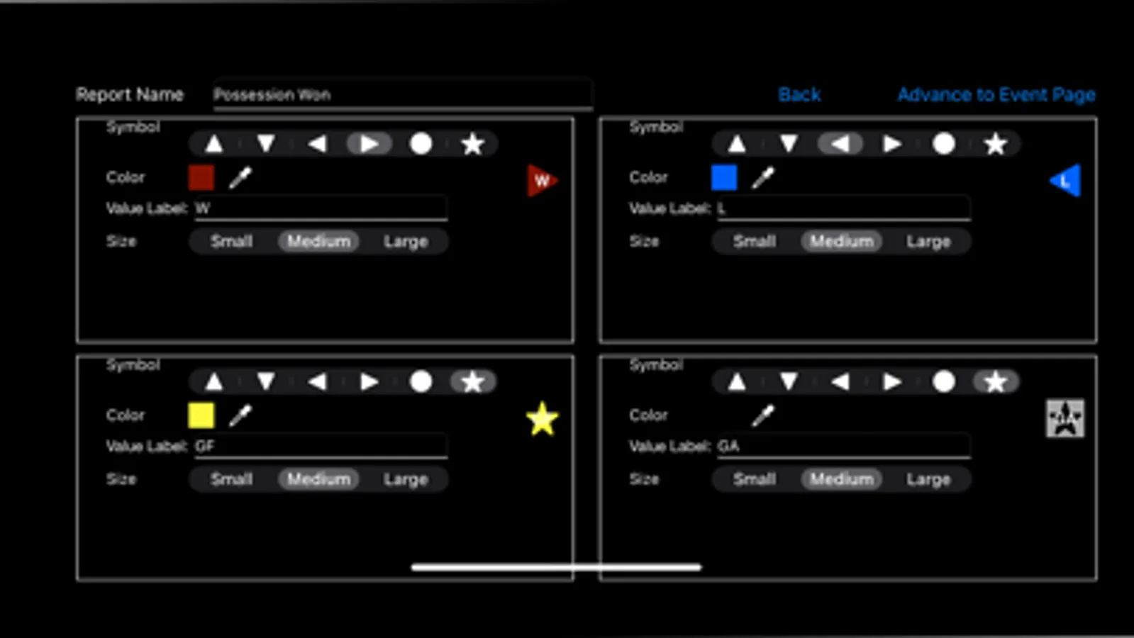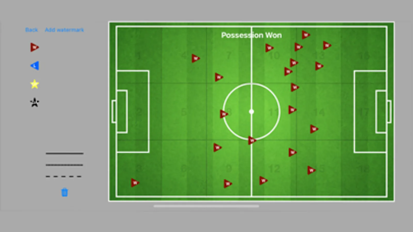 Soccer Stats Map Users are able to quickly create and label graphics to show goal scoring opportunities, successful pressing events, 50/50 balls won and lost, where on the field progression has been more or less successful, penalty box entries, etc. Coaches can show any aspect of the game they hope to share.