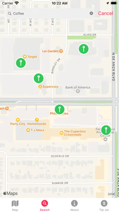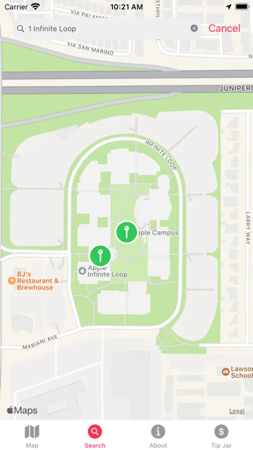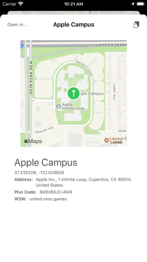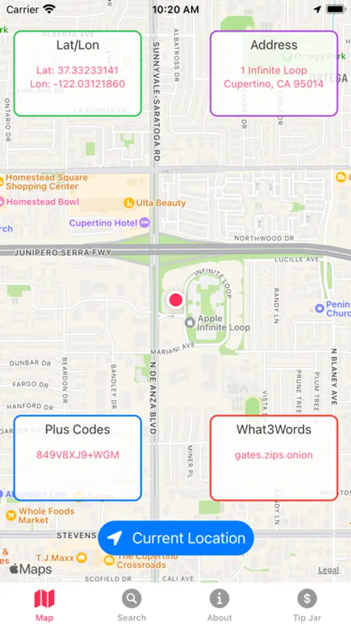 You can also use The Location App to search for a specific address, lat/long pair, location name, a specific Plus Code or a What 3 Words code. If the search term is located, pins will be place on the map and you can tap on a pin to get all of the location information for that pin. Optionally, you can then open the item in Apple Maps or Google Maps.