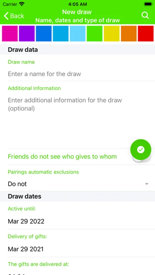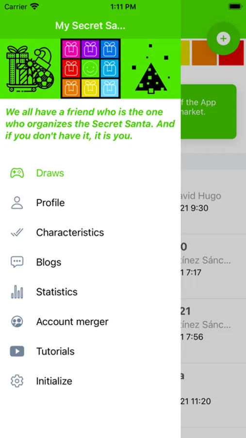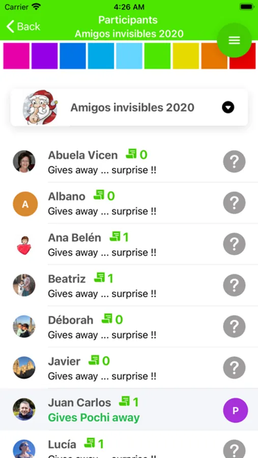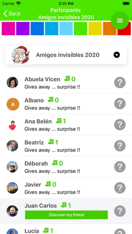 If the draw is invisible, only the list of participants will appear, without revealing the pairings. In this case, a green button will appear below your name with the text DISCOVER MY FRIEND, which when pressed, will indicate the person to whom you have to give a gift.