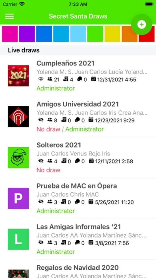 Once the invisible friends are drawn, the draw is added to your draw list. By clicking on a draw, we access the list of participants with their pairings.