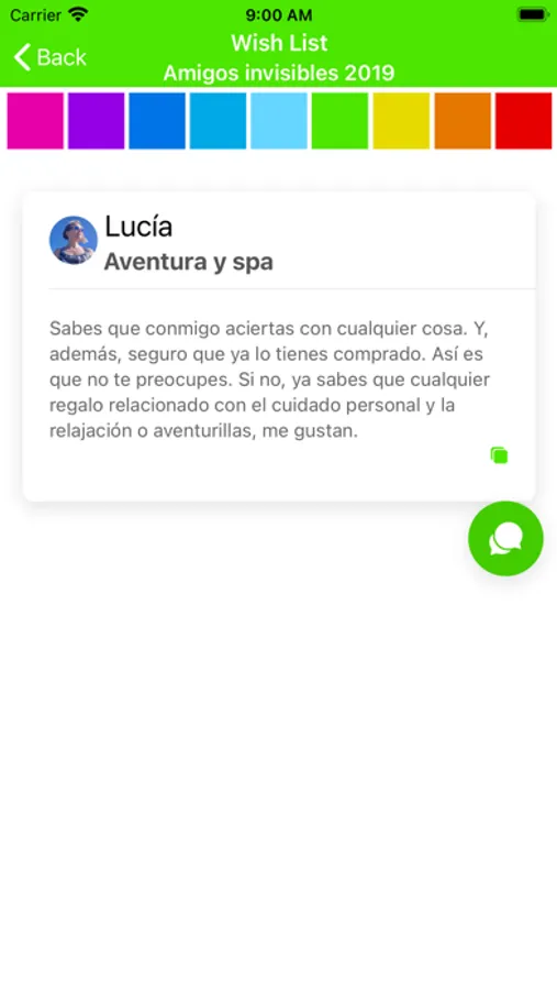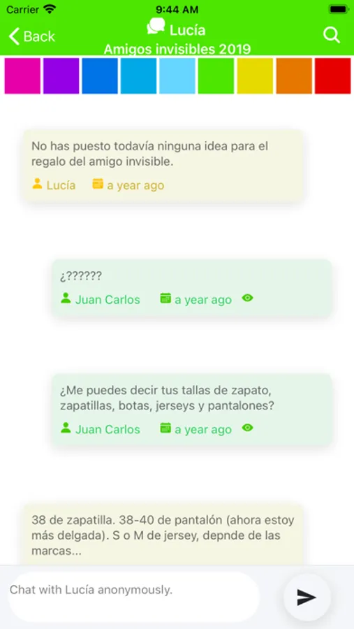 You can also chat anonymously with your invisible friend or with the person to whom you have had to give. Very useful to ask for example clothing size, shoe size, preferences, etc. The exchange of messages is anonymous, except in visible draws, where all participants see the matches generated.