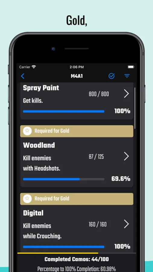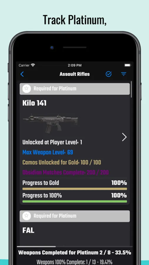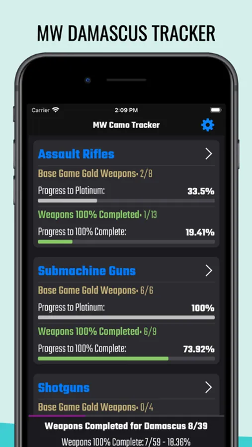 You can track your progress to Damascus/100% completion with this app. With individual camos, gold, platinum and obsidian. Easily complete classes, weapons and camos with a tap of a button. Please note you will need to buy premium to gain access to all classes. The assault rifle class is included for free!