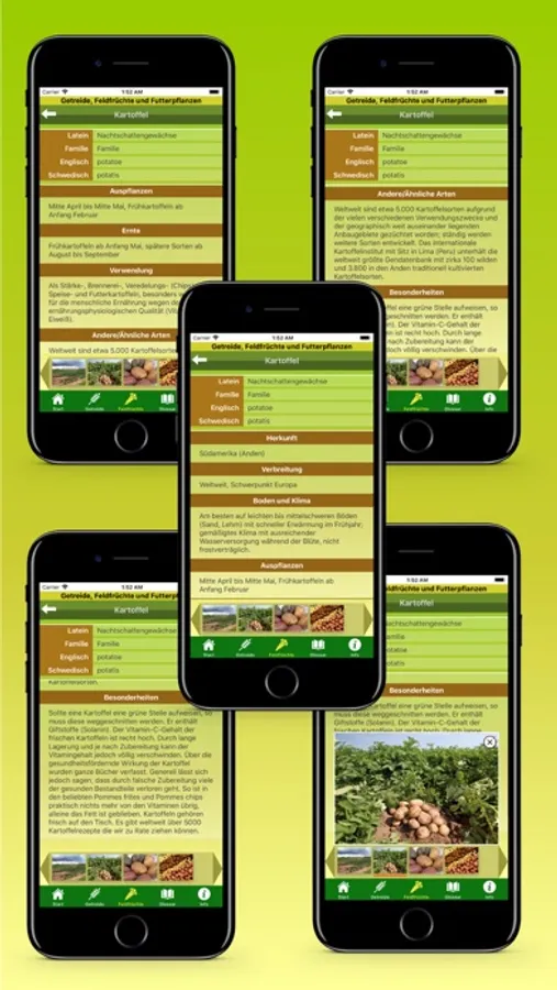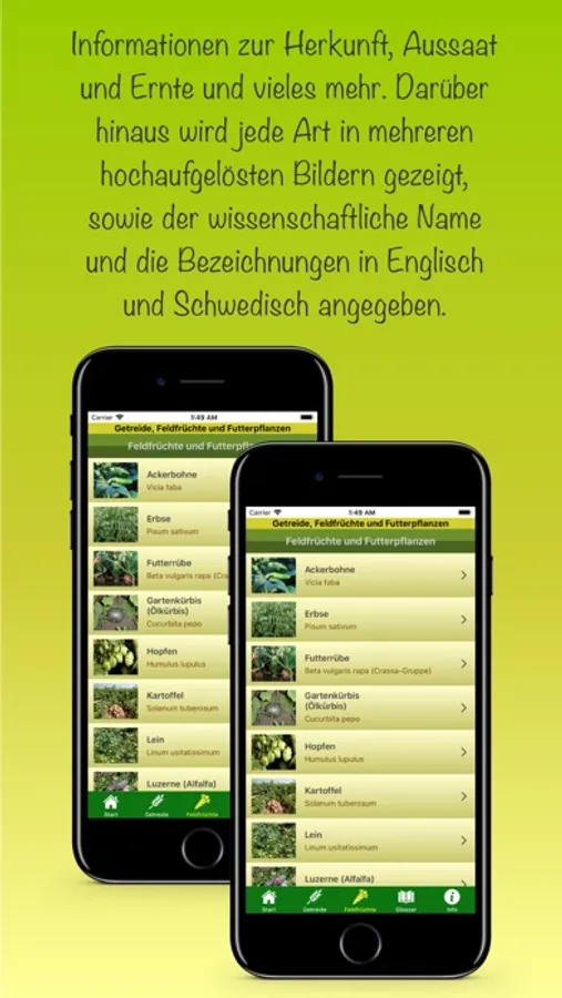 Ausführliche Beschreibungen der wichtigsten heimischen Getreidearten und Feldfrüchte. Informationen zur Herkunft, Aussaat und Ernte und vieles mehr. Darüber hinaus wird jede Art in mehreren hochaufgelösten Bildern gezeigt, sowie der wissenschaftliche Name und die Bezeichnungen in Englisch und Schwedisch angegeben.