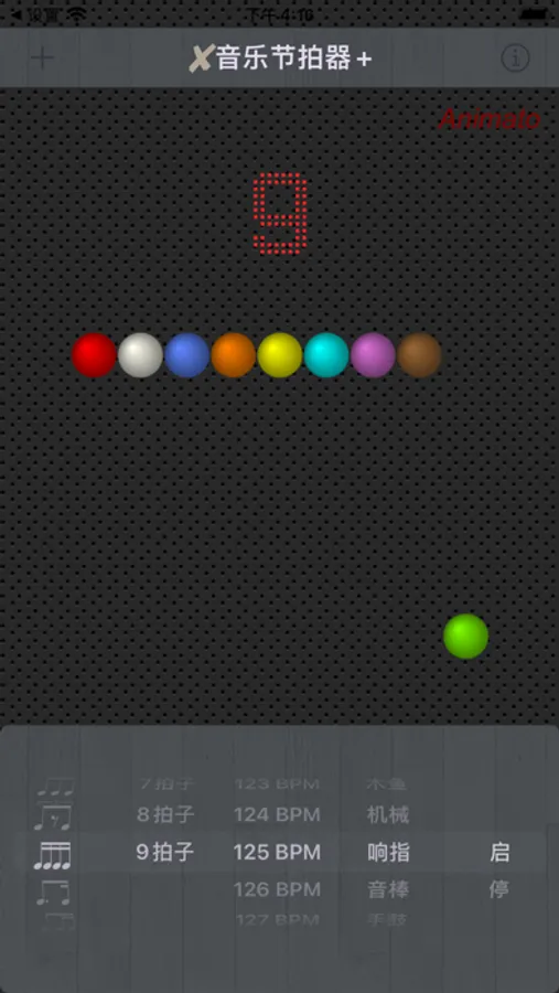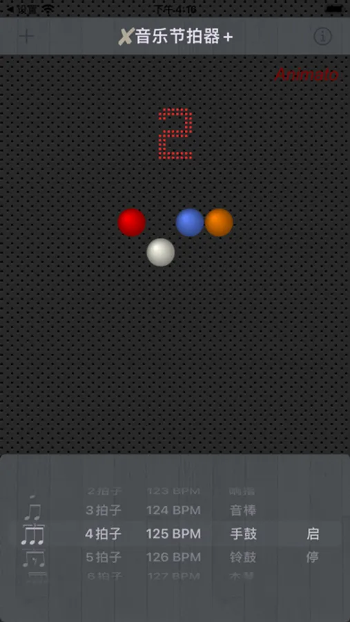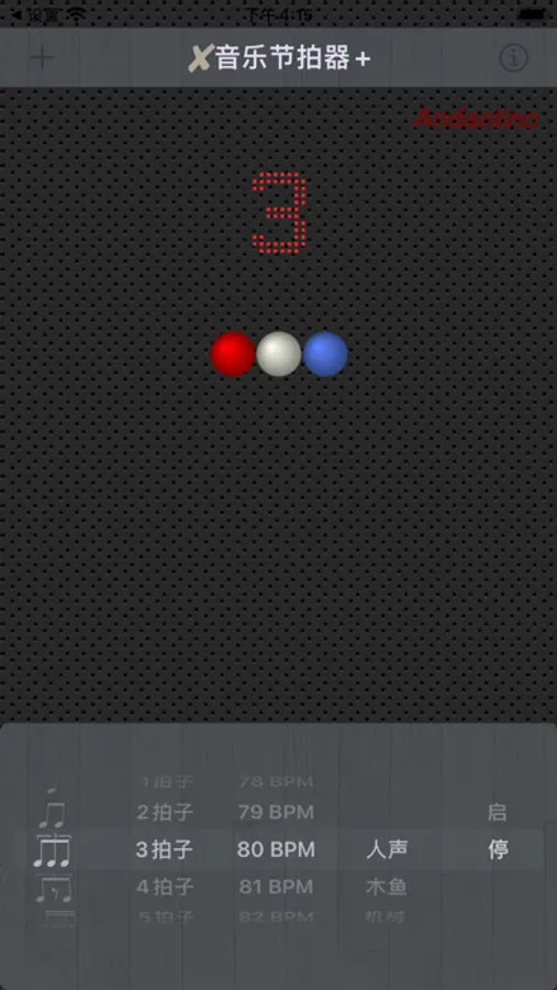节拍器使用非常简单,操纵主页面下方的5个“滚轮”就可以完成所有操作。