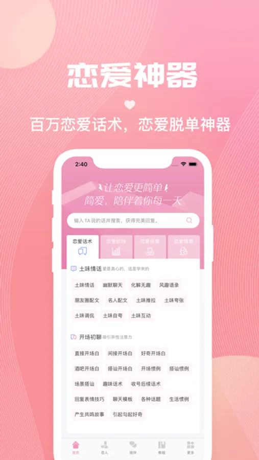 百万+恋爱话术,每日更新,包括恋爱话术,恋爱阶段,恋爱场景,恋爱情景四大分类,另包括:土味情话,幽默聊天,化解无趣,风趣语录,朋友圈配文,名人配文,土味推拉,土味夸张,土味调侃,土味自夸,土味互动,直接开场白,间接开场白,好奇开场白,酒吧开场白,搭讪开场白,开场惯例,搭讪惯例,场景搭讪,趣味话术,收号后续话术,回复表情技巧,聊天模板,各种话题,生活惯例,产生共鸣故事,引起勾起好奇,好感测试一,好感测试二,好感测试三,学会赞美,搞笑例子,互动游戏,框架拉伸,出其不意,情感链接,冷读技巧,设立底线,星座话题,常规聊天交流,情感波动,长篇叙述故事,引导与追逐,分享与交换,拒绝自我贬低,正反冷读,角色扮演,恋爱调情,文字进挪,适当暧昧,展示魅力,感情升温,合约恋人,兴趣表达,框架筛选,接吻情景攻略,进挪惯例,独处攻略,感情升华,私密互动,网聊,夜店,酒局,街头搭讪,酒吧,餐厅,咖啡厅,电影院,KTV,校园,购物中心,公园,暧昧期,冷战期,陌生期,友谊期,热恋期,磨合期,分手期,挽回期,收号后续,土味情话,表情话术,开场惯例,场景开场,酒吧开场,间接开场,直白开场,好奇开场,幽默聊天,化解IOD,设立框架,冷读语录,颜色星座冷读,情感链接,话题套路,游戏与陷阱,勾起好奇,共谋与赞美,聊天模板,框架与拉伸,生活分享,互动与游戏,废测应对,共鸣故事,风趣自然,情感波动,讲故事,正反冷读,引导追逐,好感测试,话块连情,聊天交流,高价值刻画,恋爱气氛,合约恋人,在乎度测试,暧昧话术,角色扮演,文字进挪,隐形吸引,关系升高,表达兴趣,约会碰面,约会冷场,约会互动,约会后续话术,邀约话术,浪漫创意约会,感情升温,牵手,进挪惯例,接吻,试探,空间互动,做我女朋友,回家相处,自夸类别,互动类别,调侃类别,打闹,框架筛选,推拉,名人配文,朋友圈配文等145个子分类。支持智能聚合搜索,方便您找到最佳恋爱话术,轻松和心爱的人互动,教你轻松学会聊天,让你快速脱单,追到自己心仪的对象!