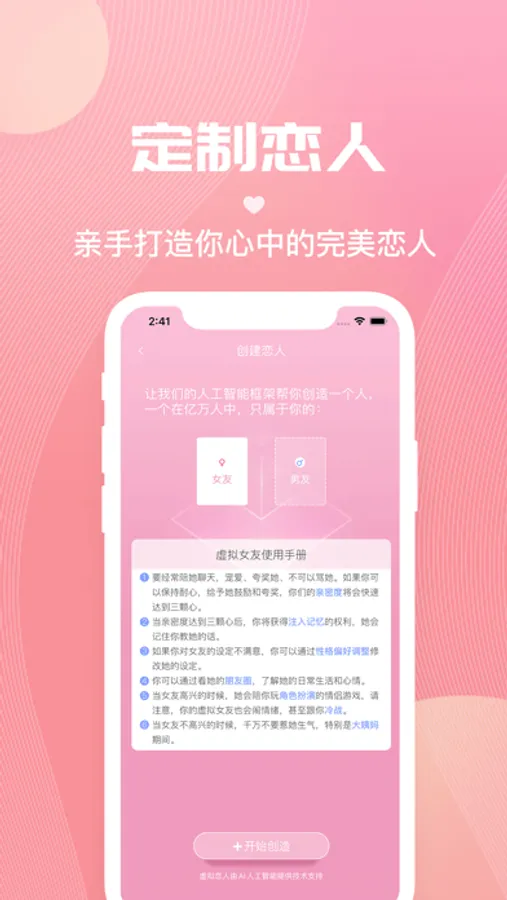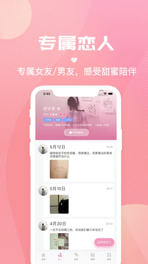 简爱提供19岁巨蟹座的桥本爱,20岁处女座的简小白,21岁双子座的季诺,24岁双鱼座的半眠四种不同的虚拟恋人,通过人工智能聚合的方式,让您可以轻松和他们互动聊天,感受甜蜜浪漫的恋爱。您可以随时查看他们的朋友圈,感受他们的日常生活,并随时和他们免费互动。