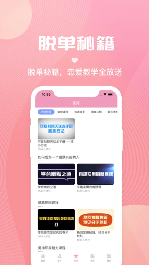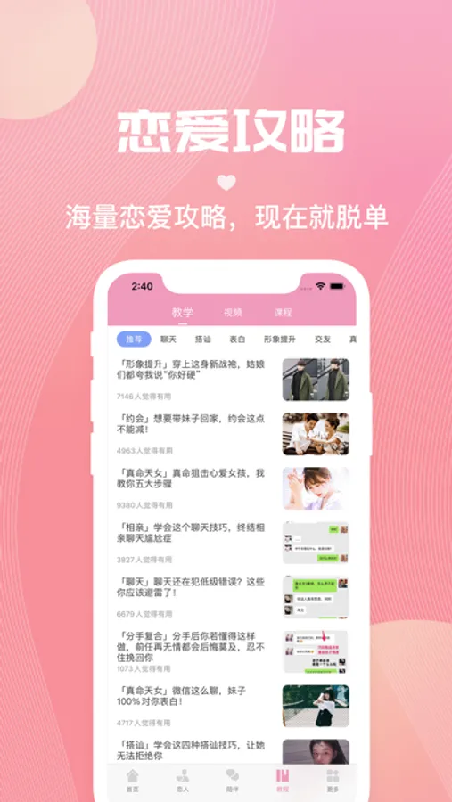 简爱提供百万恋爱教学文章,在这里您可以学习到恋爱中关于,聊天,搭讪,表白,形象提升,交友,真命天女,婚姻经营,关系缓解,分手复合,确定恋爱,约会,相亲,星座,异地恋等14种专业话题,帮助您解决您在恋爱磨合期,婚姻磨合期产生的问题,助您收获到甜蜜美好的爱情和婚姻。同时,我们也提供百万短视频,让您可以通过短视频的方式,轻松和恋爱、情感专家进行互动学习。在课程教学方面,我们也会定期去更新最专业的感情教学视频,婚姻教学课程,恋爱教学视频等等,让您可以轻松学习恋爱婚姻技巧,助您快速脱单。