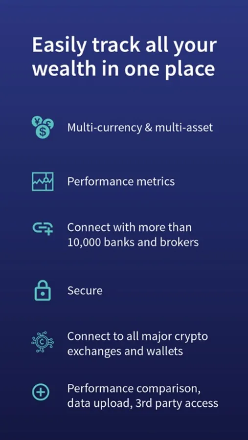 Crypto, stocks, ETFs, properties, loans, luxury assets, commodities, investments in private companies, retirement plans and more.