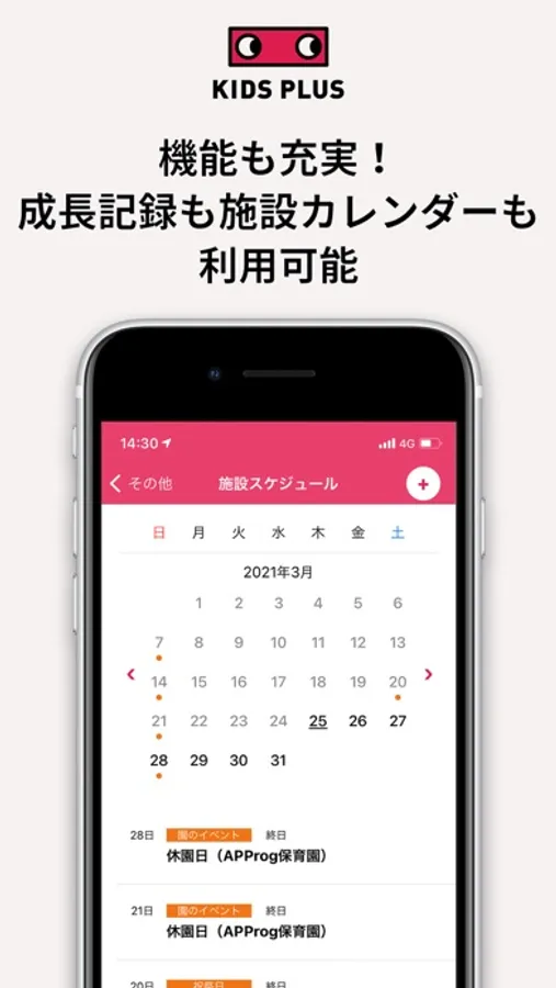 kids plusでは、子育て支援施設からの連絡帳やお知らせ配信の確認、入退室専用カメレンコードの表示、お休み連絡など、アプリで確認することができます。