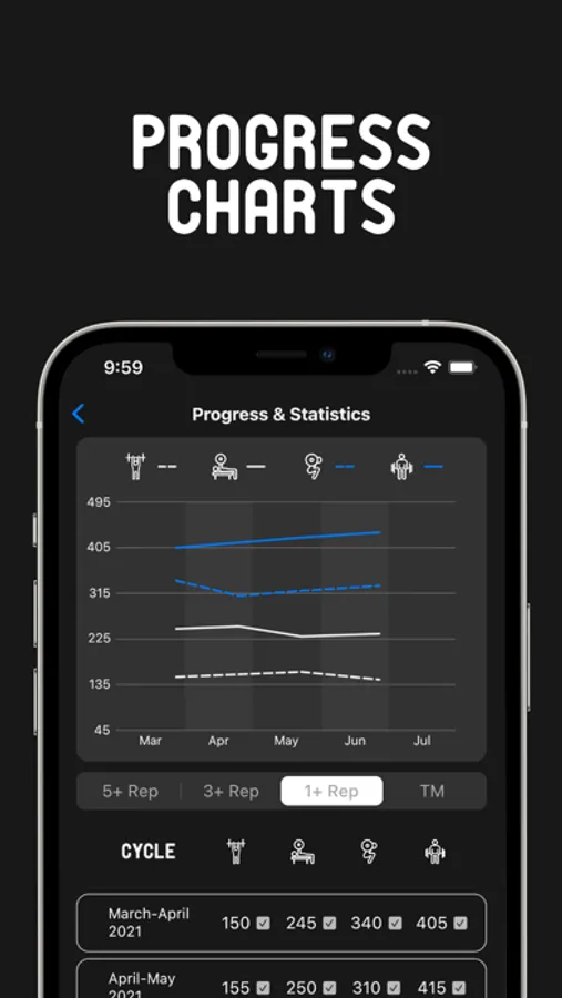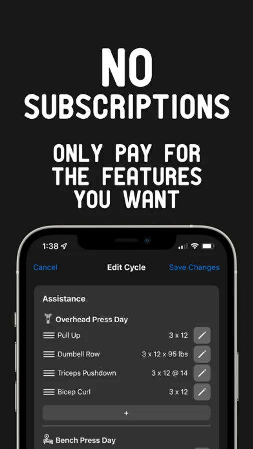 No more bringing a crumbled workout sheet to the gym, no more messing around spreadsheets to update your weights. From calculating your cycles, to telling you what plates to put on the bar, Five/Three/One does it all.