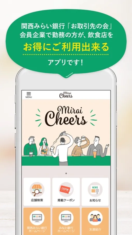 このアプリは、関西みらい銀行「お取引先の会」会員企業で勤務する人が飲食店をおトクに利用できるアプリです。