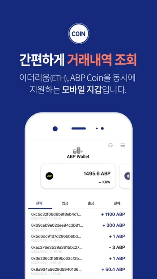 - 이더리움(ETH), ABP Coin을 동시에 지원하는 모바일 지갑입니다.