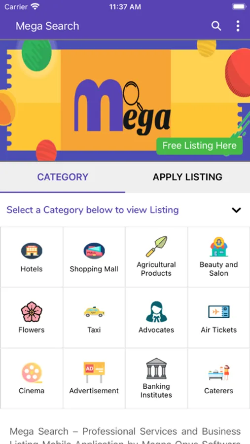 Mega Search is a city based search engine to get easy access to local services. Organizations and professionals throughout the world can submit their listing to appear on Mega Search. While submitting their listing they have to choose the service category to which their service or products relates. The approved organizations and professionals will appear on selecting a city and service category. The approved merchants will have direct access to their dashboard and they can update the information regarding their services, description, image gallery, contact details, and location information etc. Users will be able to view average rating of each organization under various categories, its description and details about services and features provided by the organization. They can also submit feedback for any organization and post a query to any service provider which will be emailed to the merchants directly.