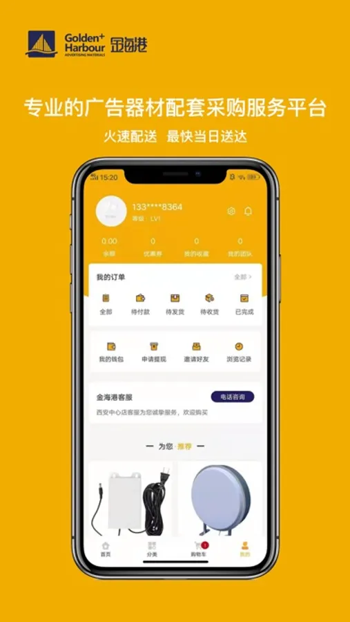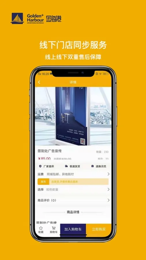 金海港——专业的广告器材配套采购服务平台 金海港广告器材有限公司在全国拥有多加连锁店面,经营十多个系列上万种广告器材产品,年营业额上亿。建立网上采购平台,提供线上直采、批量代采、全国发货等服务,并提供了更为全面的售后系统服务,满足众多客户不同采购需求。