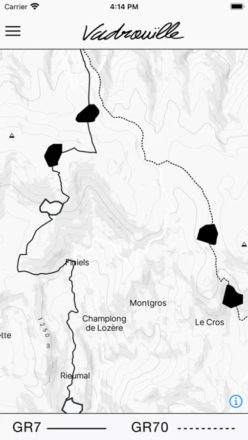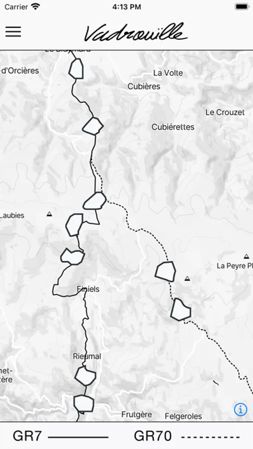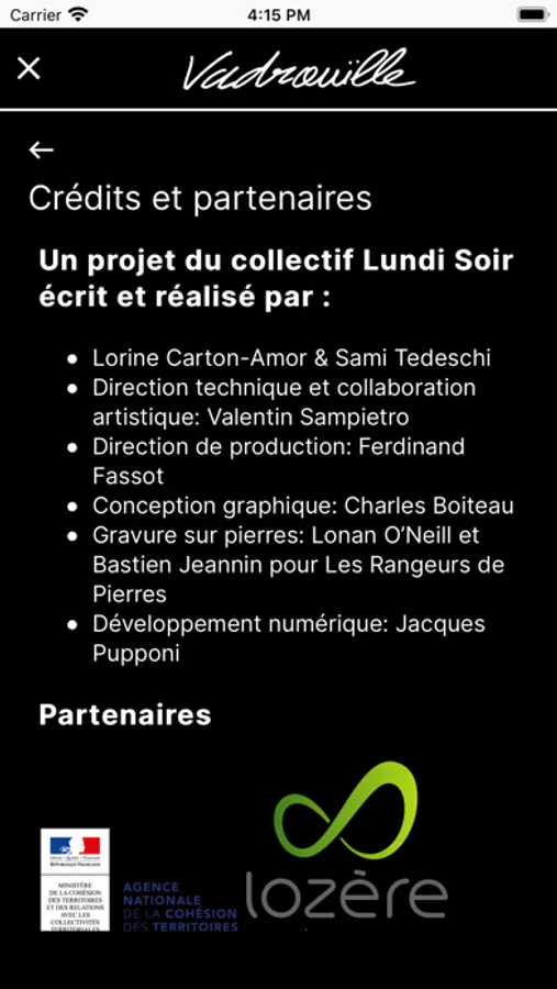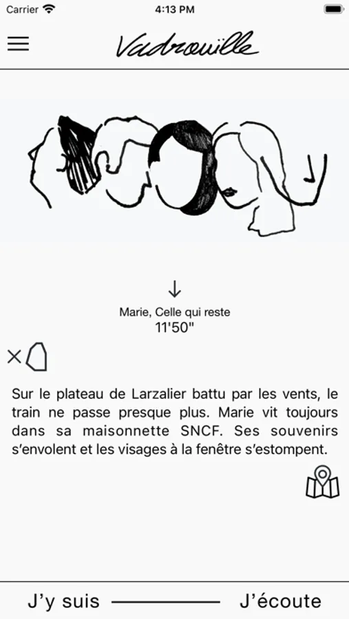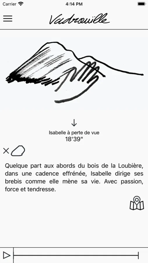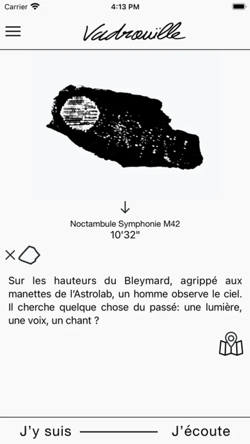 L’application Vadrouïlle a été développée spécialement pour le projet. En plus des 7 créations sonores proposées, elle permet de donner des informations pratiques aux randonneurs et randonneuses qui veulent les écouter : description détaillée du projet, points d’emplacement des pierres gravées, carte du territoire et géolocalisation, adresses des points de prêt et de rendu des kits d’écoute.