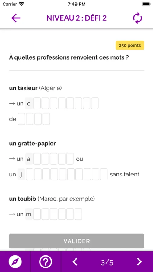 Composée de 4 niveaux thématiques (la gastronomie, le travail, l'environnement et le corps et l'esprit) de difficulté progressive, l'application Défis DDF propose 16 promenades à travers la richesse lexicale de la langue française.