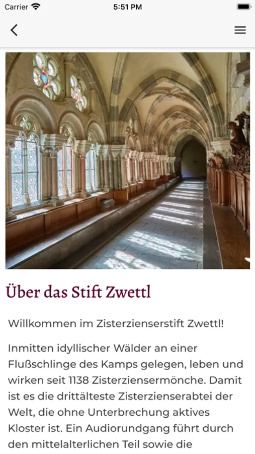 This app offers interesting facts about the Cistercian monastery Zwettl, founded in 1138, using an interactive map and a guided audio tour. Visitors discover both, the interior and the exterior, and enjoy the unique atmosphere of the location. Life in a medieval monastery can be discovered during a tour of the cloister with fountain house, chapter house, dormitory and necessarium. The typical Cistercian location at the river can be experienced, too.