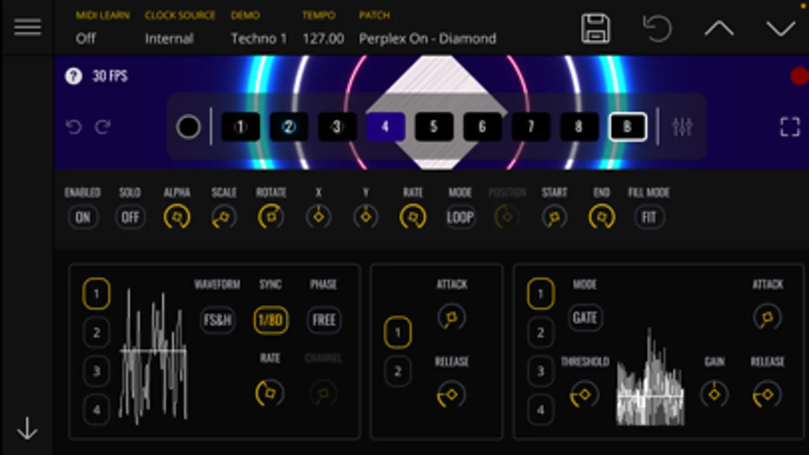As the name suggests, VS Visual Synthesizer can be played live like an audio synthesizer; use your MIDI keyboard to make each layer come alive with the concept of ‘polyphonic visual voices’.