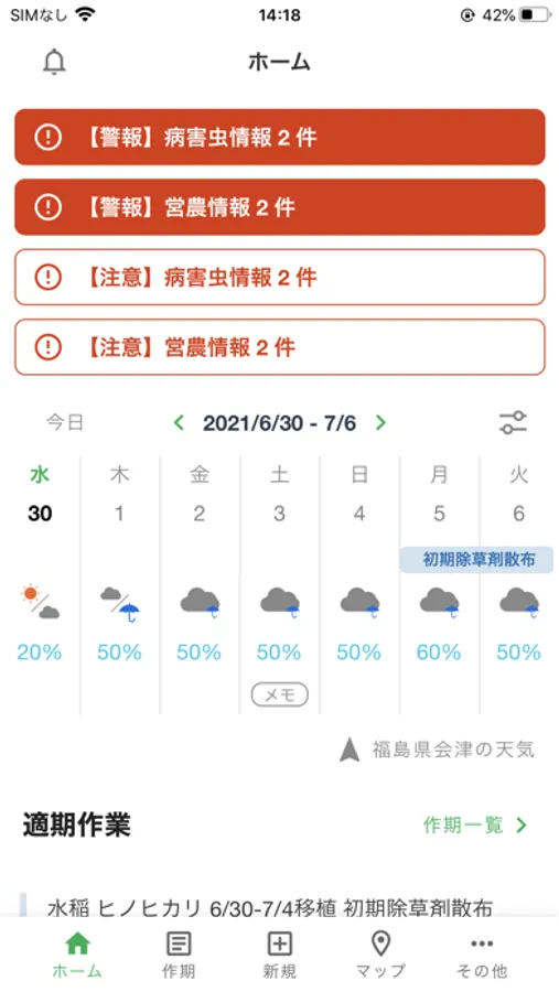 気象アラートや病害虫発生アラート、栽培管理アラート(高温障害、冷害)、水位アラートなど、日々の環境に合わせたアラートを受け取ることができます。