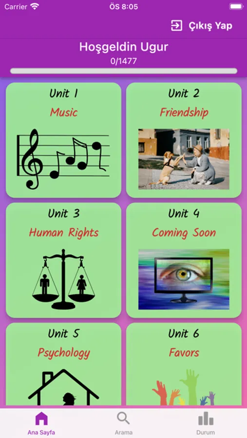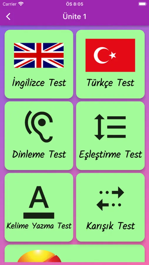 Herbir ünite için ayrı bir bölüm olmasının yanında tüm kelimeleri çalışabileceği genel bir test bölümü de bulunmaktadır.