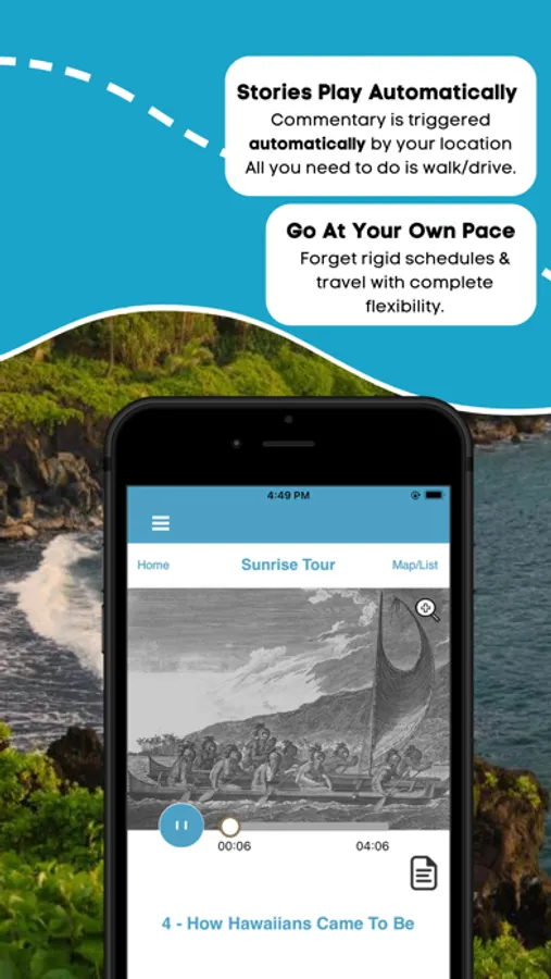 As you travel, audio stories play automatically based on your location. Simply go to the starting point and follow the given route. Each story begins playing on its own, usually just before you reach a point of interest.