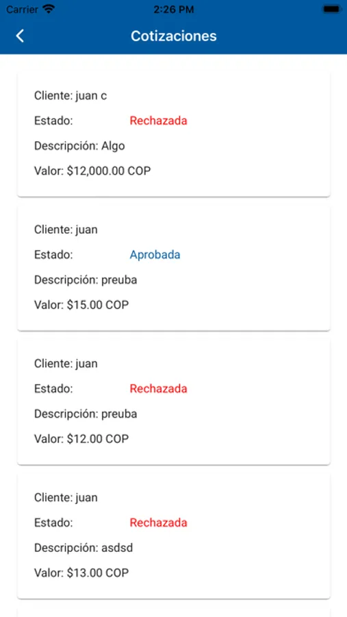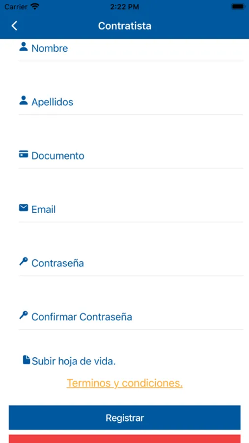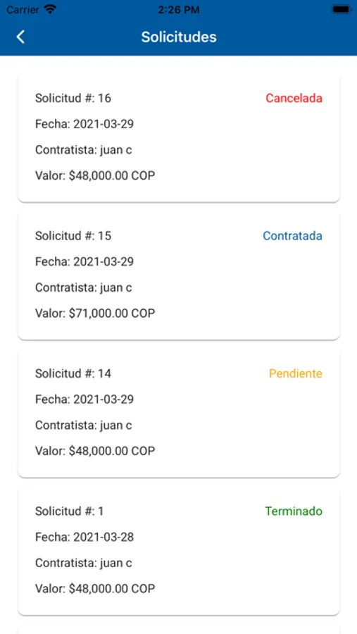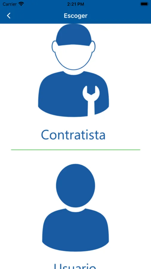 La aplicación maneja servicios por contratista en el cual puede elegir el que desee y ademas cuenta con un campo de servicios personalizados si su solicitud aun no esta en la lista pre configurada.