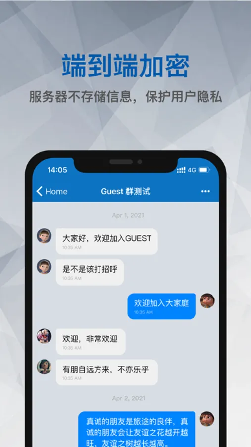 产品采用邀请注册制,轻量化设计,简洁清爽无广告、无会员,针对用户通讯信息采用端到端加密设计,保护用户隐私。服务器不保存任何用户认证信息。给用户一个安静,安全隐私的聊天环境。