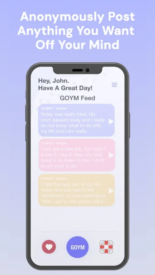 Get It Off Your Mind is a anonymous social network for those that need to get anything off their mind. Users can post what they want to get off their mind, and they will receive love and positive affirmations from fellow anonymous users.