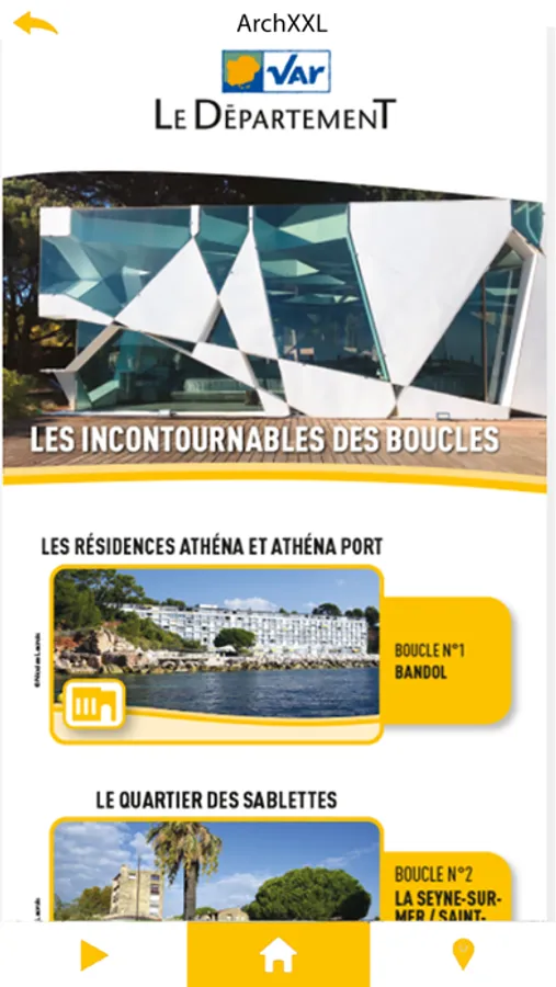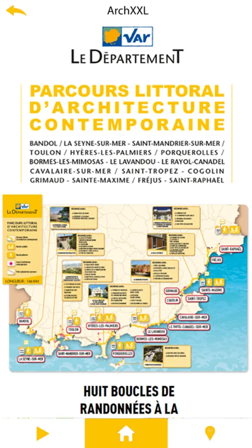 Credits: Application designed by the Département du Var and created by AudioSpot. The "Parcours Littoral d’Architecture Contemporaine” (Coastal Contemporary Architecture Trail) is brought to you by the Conseil Départemental du Var.