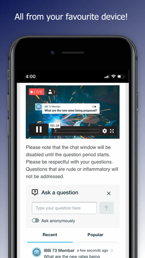 Keep up to date with your Union using the Boilermakers Local 73 live broadcast application. Watch live streaming business manager updates on your mobile device from the comfort of your home. Interact with your Union by asking questions and responding to polls.
