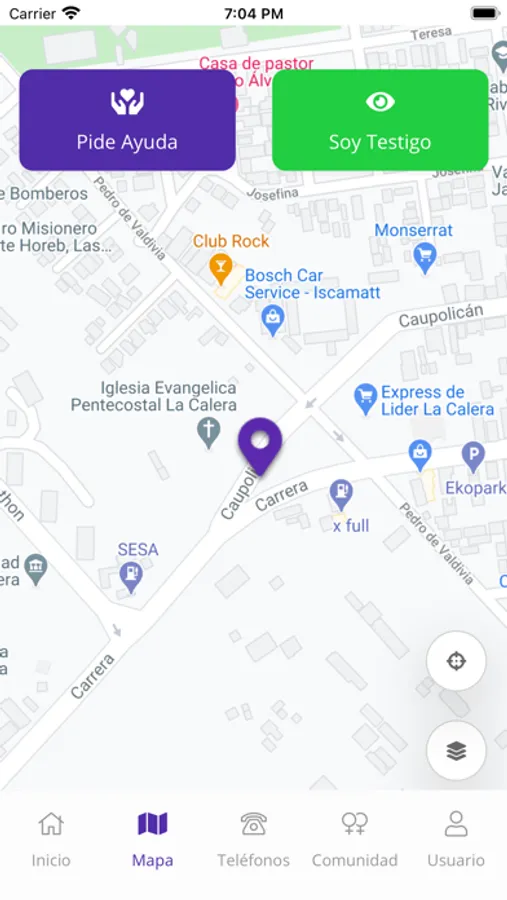 Dentro de la aplicación podrán alertar con un punto en el mapa sobre una situación de violencia de género. Si eres tú quien necesita ayuda tendrás el botón “Pedir ayuda”, a su vez si eres testigo tendrás el botón “Eres Testigo”.