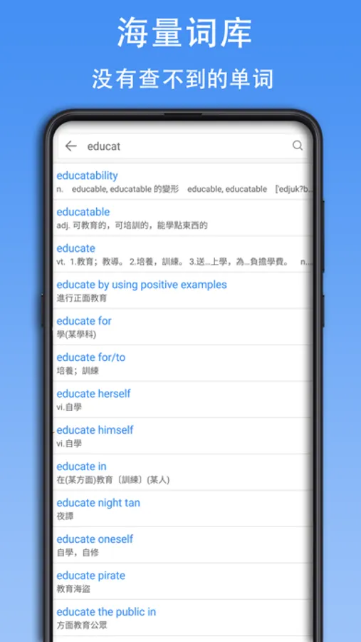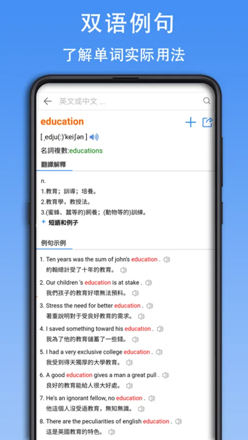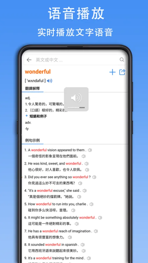 2. 详尽的解释。包含例句发音同义词等,让您全面了解词汇用法