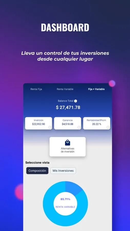 Luego de haber realizado una inversión con nosotros, nuestra app te brindará la opción de tener un control efectivo, ágil y transparente de tu inversión o inversiones realizadas, además de brindarte la posibilidad de tener un ordenamiento y acceso 24/7 a toda la documentación relacionada con tus inversiones.