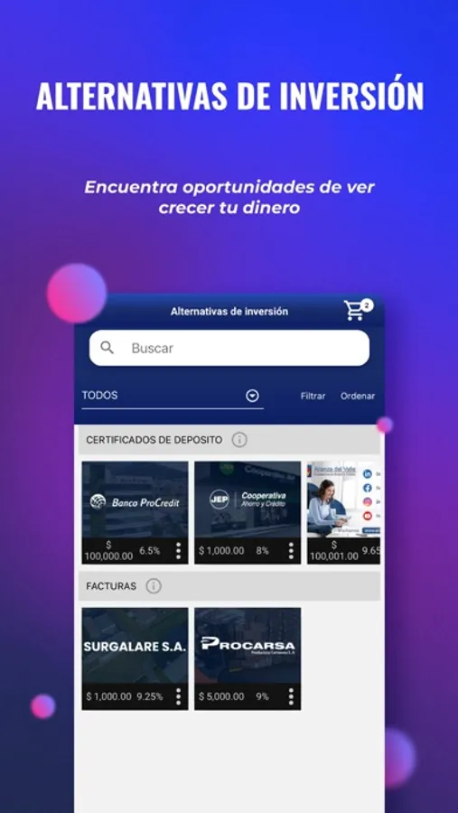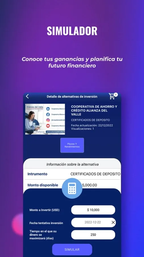 Gracias a nuestra app, podrás disfrutar de varias funcionalidades, como visualizar y disponer desde tu celular de múltiples alternativas de inversión, tales como acciones, facturas comerciales, papel comercial, obligaciones, entre otras; y además, de requerir podrás ágilmente agendar una cita virtual con nuestros especialistas y asesores para solventar cualquier duda o inquietud. También te brindamos la opción de simular fácilmente las inversiones que estás pensando realizar.